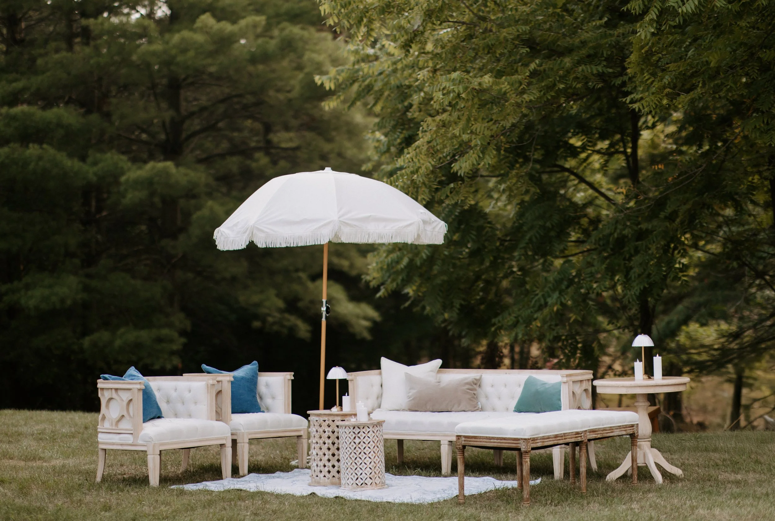 The tented reception area sits at the far end of the lawn, with a clear-top canopy installed over a newly built composite deck. Cocktail hour flows out onto the adjacent lawn space, perfect for mingling as the sun sets. Walking trails and soft lighting will guide guests through the grounds, creating a magical evening atmosphere.